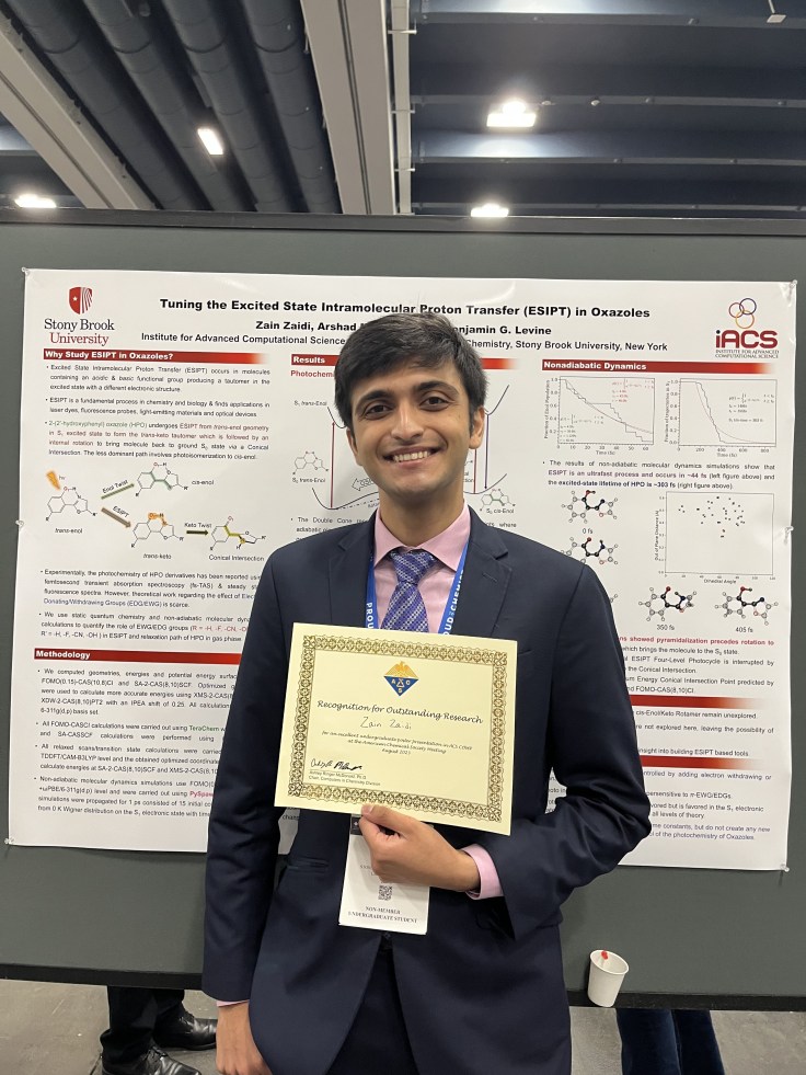 Congratulations to Zain, who (as a rising sophomore!) won the ACS COMP Division Undergraduate Poster Award at the Fall 2023 National Meeting of the ACS in San Francisco. Great job, Zain, and great job to his postdoc mentor, Arshad!